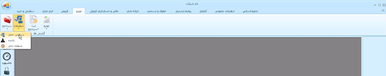 براي ثبت سرجمع نياز به يكسري تنظيمات اوليه داريم .سرويس حمل و راننده و منطقه حمل بايد از قبل تعريف شده باشد . در بخش توزيع از گروه تنظيمات منوي سرويس حمل را انتخاب كنيد
