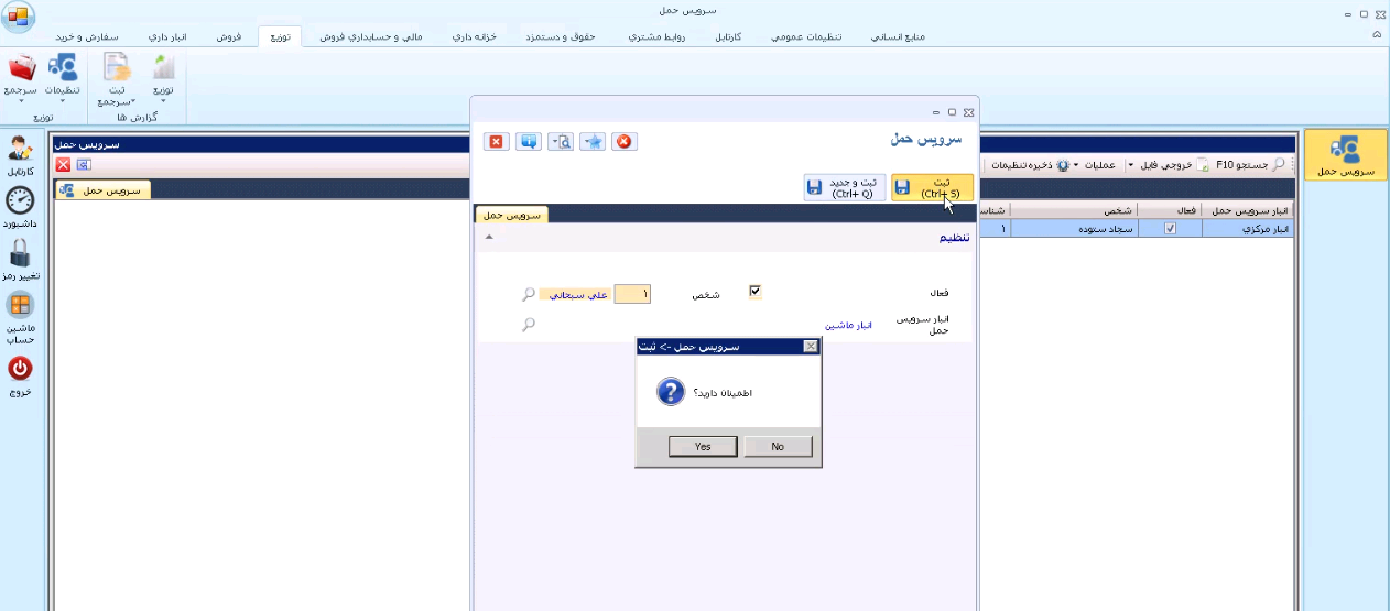 در صفحه باز شده كليك راست كرده و از منوي باز شده گزينه جديد را انتخاب كنيد . صفحه ايجاد سرويس حمل براي شما باز خواهد شد .ابتدا تيك فعال را بزنيد . در قسمت اشخاص يك نفر را از ميان اشخاص موجود در سيستم يا همان كارمندان و پرسنل را انتخاب كنيد . در قسمت انبار سرويس حمل نيز نام انبار سرويس حمل را انتخاب كنيد .سپس با استفاده از كليد ثبت سرويس حمل را ذخيره نماييد
