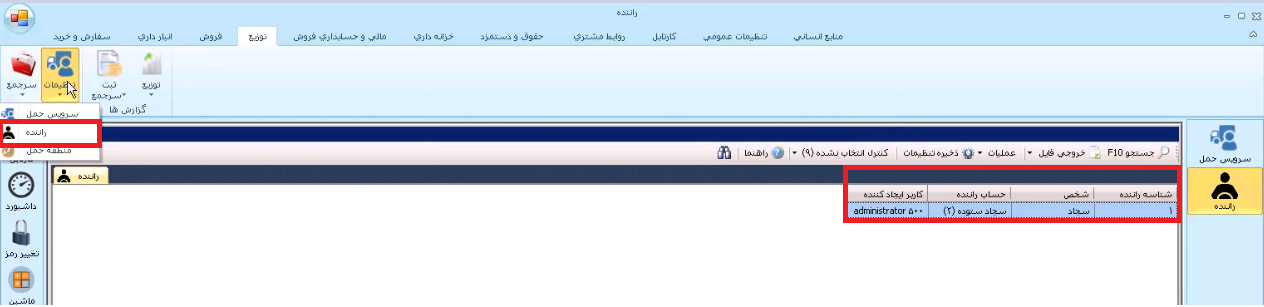 مجدد از بخش توزيع از گروه تنظيمات اين بار منوي راننده را كليك كنيد . در اين صفحه راننده اي كه قرار است سرجمع و كالاي سرجمع را حمل كند انتخاب مي شود