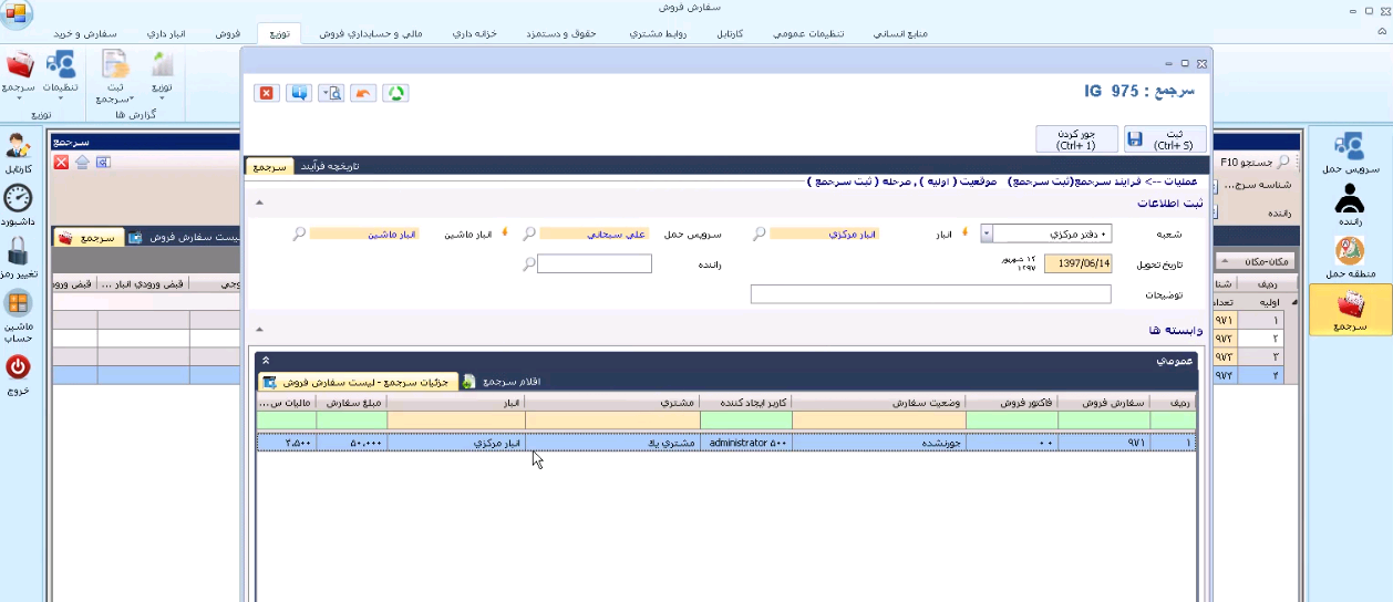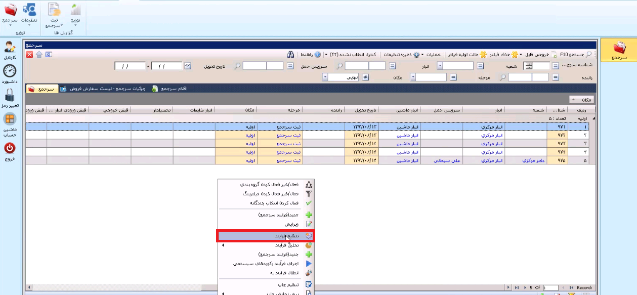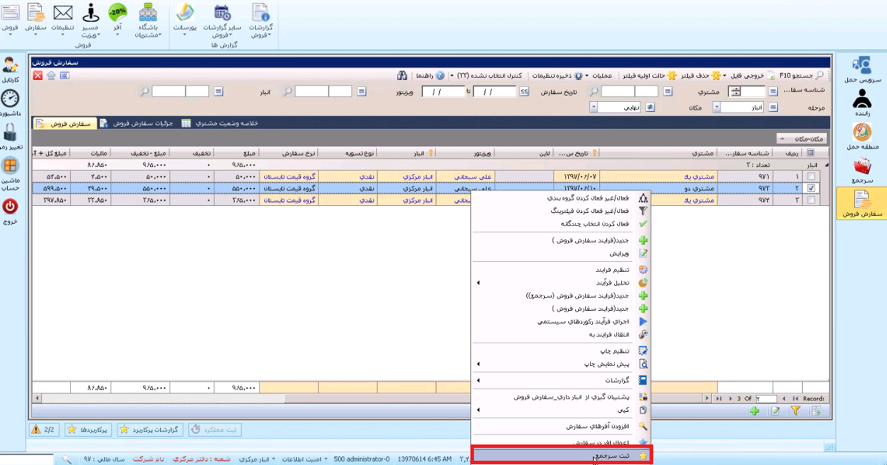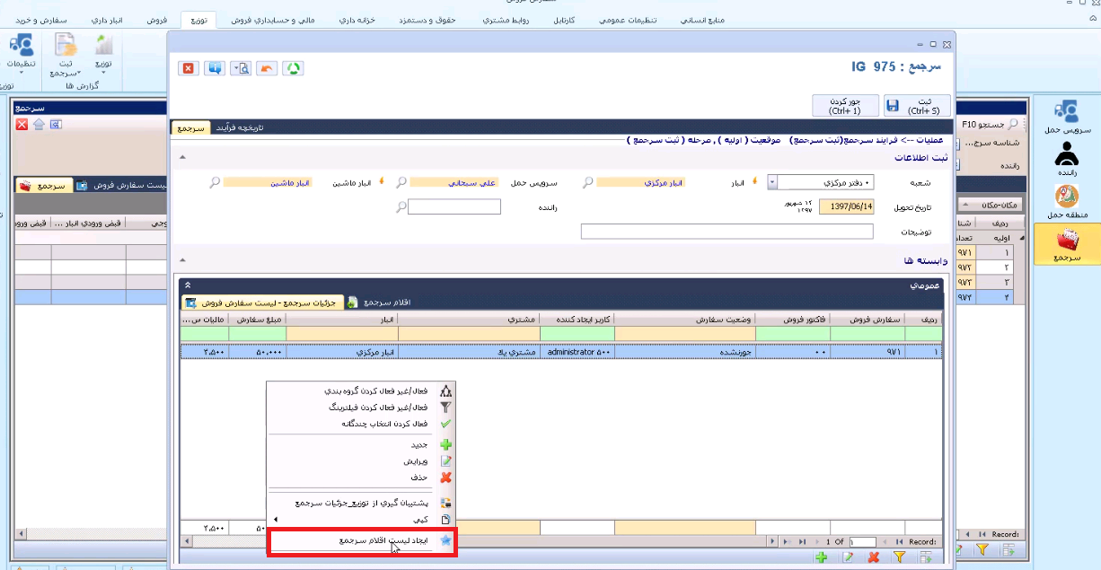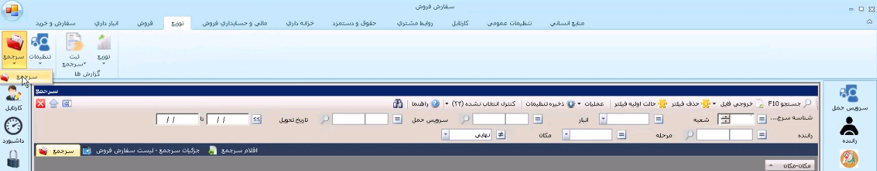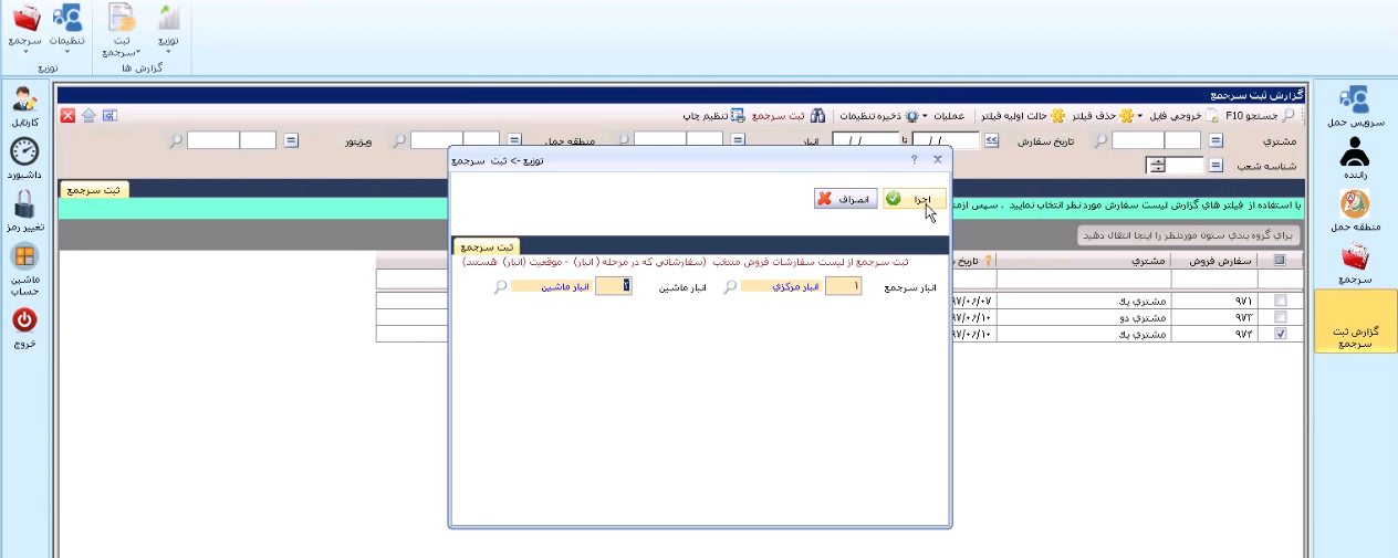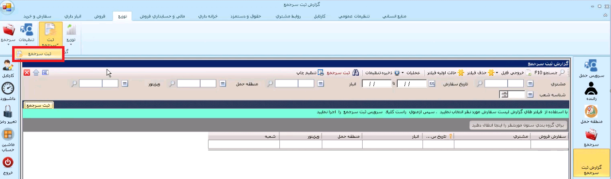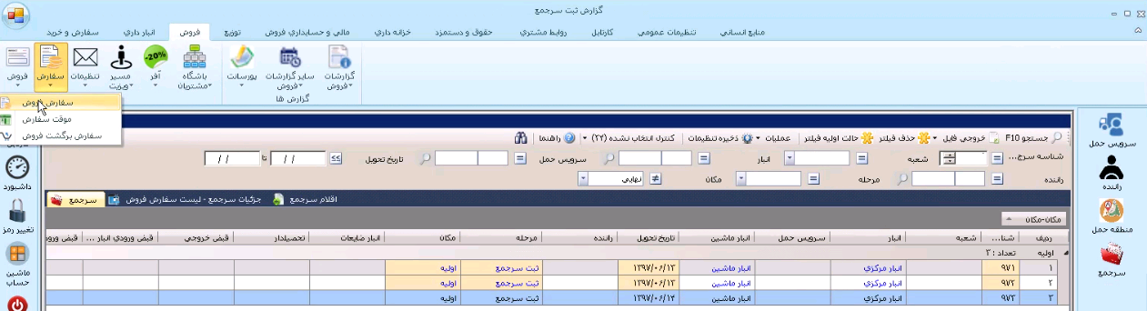 در صفحه گزارش ثبت سرجمع سفارشاتي كه توي مرحله انبار موقعيت انبار هستندبا زدن دكمه جستجو فيلتر مي شوند . البته ميتوانيد با فيلترهاي بالاي صفحه مواردخاص تري را نيز انتخاب كنيد . شما مي توانيد روي قسمت خالي اي از صفحه راست كليك كنيد و فعال كردن تيك را كليك كنيد . باانتخاب اين گزينه كنار هر رديف از سفارشات يك تيك قرار ميگيرد و مي توانيد با توجه به منطقه حمل يا ويزيتور يا شعبه ,هر كدام از سفارشاتي را كه مي خواهيد انتخاب كنيد .پس از انتخاب سفارشات دوباره كليك راست كنيد شما مي توانيد گزينه سرجمع يا گزينه افزودن سفارش به سرجمع را كليك كنيد