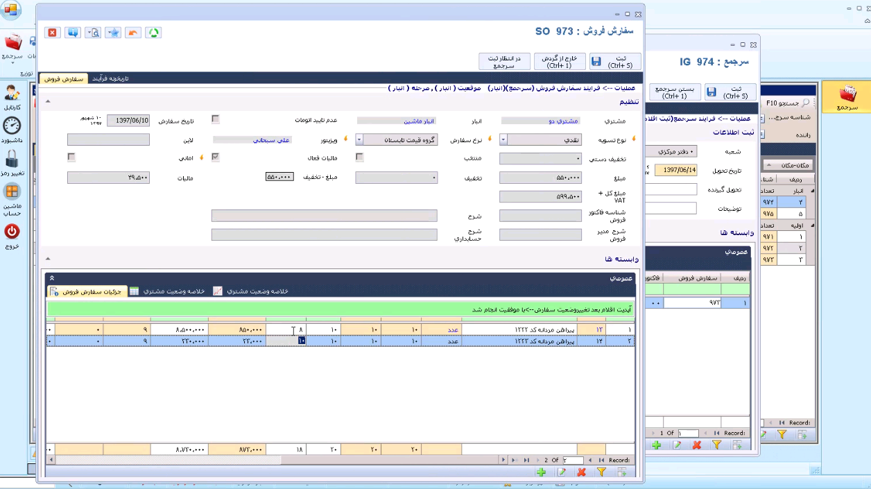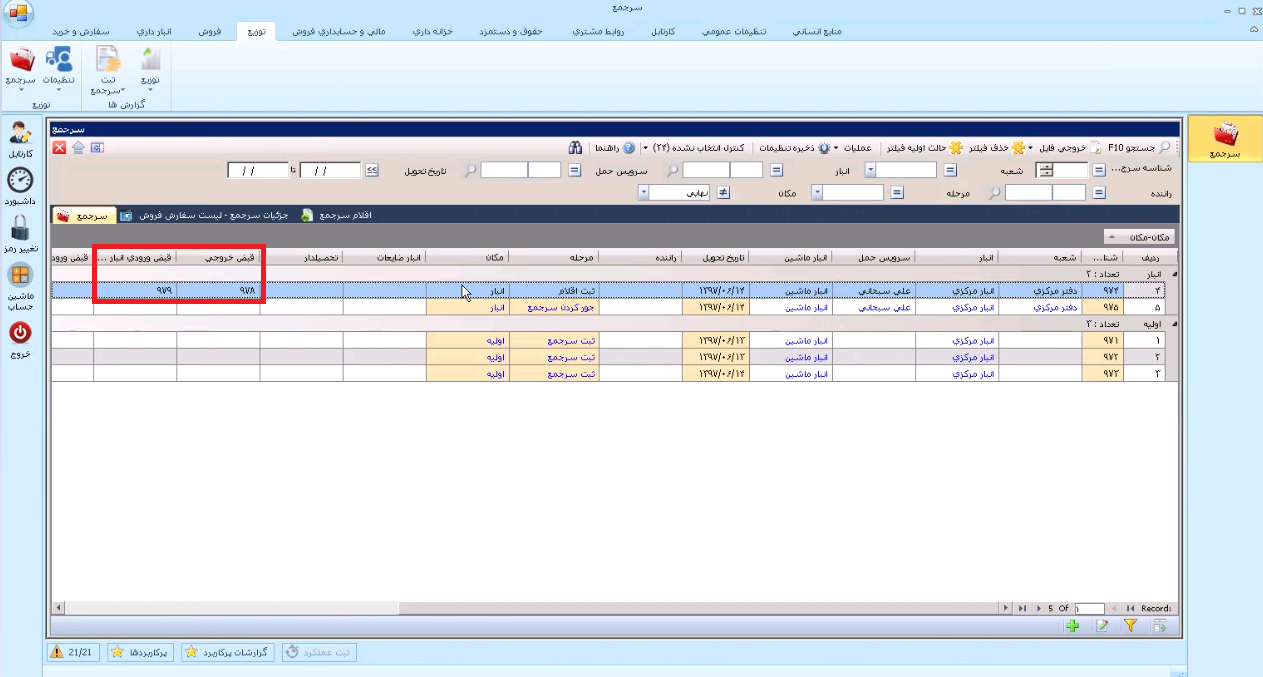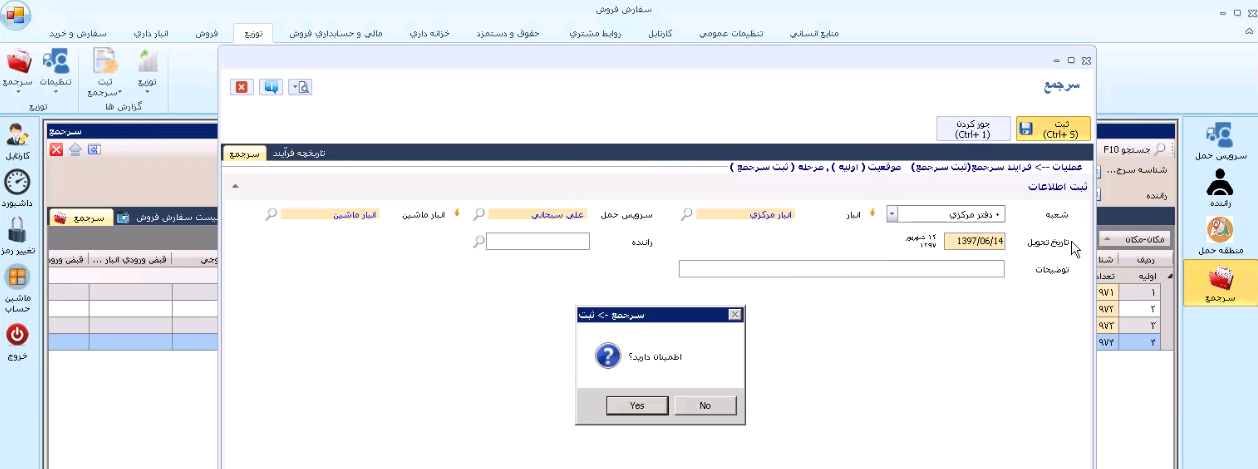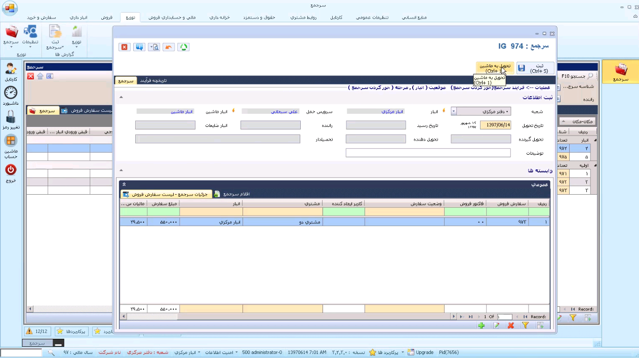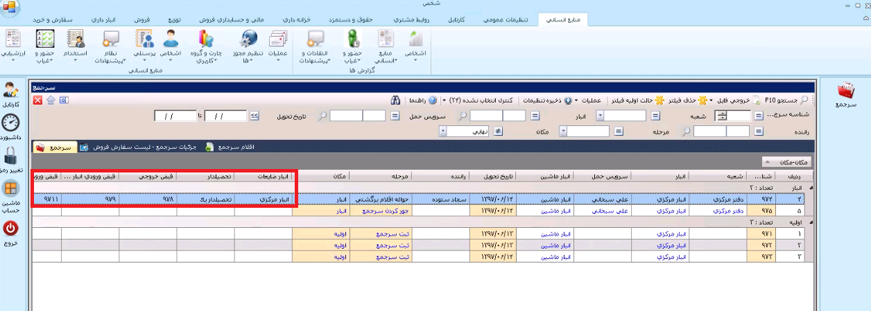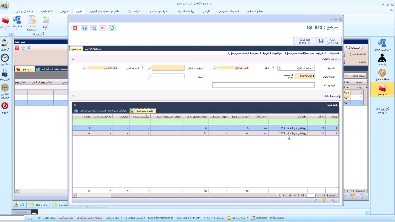 در صفحه گزارش ثبت سرجمع سفارشاتي كه توي مرحله انبار موقعيت انبار هستندبا زدن دكمه جستجو فيلتر مي شوند . البته ميتوانيد با فيلترهاي بالاي صفحه مواردخاص تري را نيز انتخاب كنيد . شما مي توانيد روي قسمت خالي اي از صفحه راست كليك كنيد و فعال كردن تيك را كليك كنيد . باانتخاب اين گزينه كنار هر رديف از سفارشات يك تيك قرار ميگيرد و مي توانيد با توجه به منطقه حمل يا ويزيتور يا شعبه ,هر كدام از سفارشاتي را كه مي خواهيد انتخاب كنيد .پس از انتخاب سفارشات دوباره كليك راست كنيد شما مي توانيد گزينه سرجمع يا گزينه افزودن سفارش به سرجمع را كليك كنيد