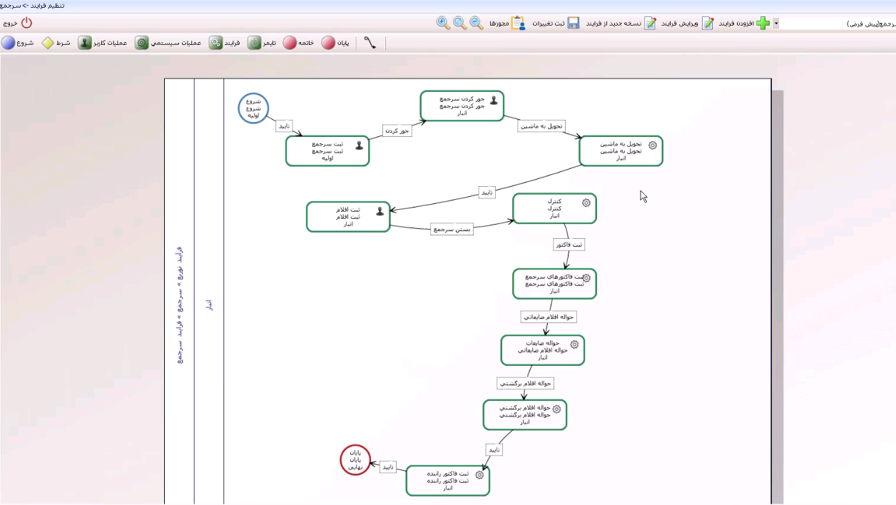 ماشيني كه كالاها را حمل مي كند كالاها راتحويل مشتري مي دهد .سپس اگر اقلام ضايعاتي داشته باشد از انبار ماشين اقلام ضايعاتي را به انبار ضايعات حواله ميزنيم اگر اقلام برگشتي داشته باشد از انبار ماشين ان كالاها را به انبار اصلي حواله ميزنيم وموارد نامعلوم را براي راننده فاكتور ميكنيم و در نهايت بايد انبار ماشين صفر شود
