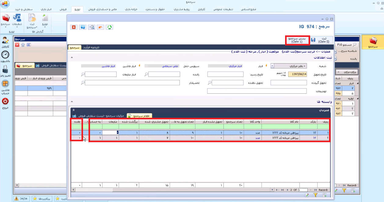 در تب اقلام سرجمع كليك راست ميكنيم و گزينه ايجاد ليست سرجمع را كليك كنيد بدين ترتيب ليست اقلام سرجمع رفرش خواهد شد . براي مثال تصوير زير را مشاهده كنيد . تعداد كل 10 تاست . تعداد فاكتور شده در رديف اول 8 تا ثبت كرديم .يك عدد كه درمرحله جور كردن انبار به خاطر نبود موجودي به عنوان تحويل نشده در امده است و همانطور كه ميبيند ستون مانده عدد يك را نشان مي دهد درحالي كه مانده هميشه بايد صفر باشد . مي توانيم اين يك عدد كالارابه عنوان برگشت شده بزنيم تا مانده صفر شود.پس ازتكميل رديف هاي سرجمع اطلاعات بالاي سرجمع از قبيل تحويل دهنده -انبارها - تاريخ رسيد و غيره را پر ميكنيم و دكمه بستن سرجمع را كليك ميكنيم