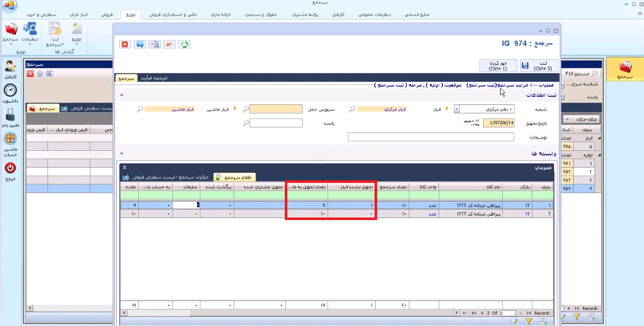 فرايند سرجمع را براي يك سرجمع طي ميكنيم تا درك اين فرايند ملموس تر شود.پس از كليك كردن روي سرجمع وارد مرحله جور كردن خواهيم شددر اين قسمت انبار چك ميكند كه ايا از اقلام داخل سرجمع موجودي دارد يا خير ؟ اگر تعدادي از هر كالا رو موجودي نداشت در ستون تحويل نشده انبار ثبت ميكند به اين معني كه اين تعدادب خاطر عدم موجودي تحويل ماشين داده نشده است.هر تعداد كه در اين ستون پر كنيد از تعداد تحويل داده شده به ماشين كسر مي شود . سپس فيلد سرويس حمل و انبارماشين را پر كنيد و دكمه ثبت كنيد